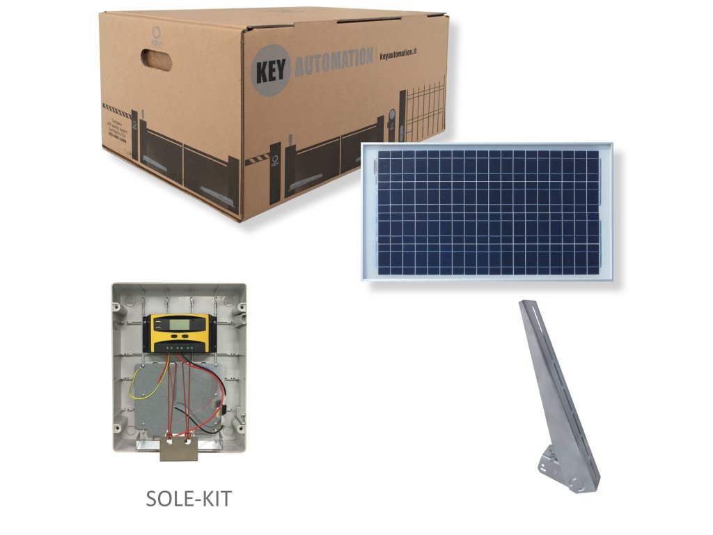 SOLE-KIT Solární KIT pro 24V pohony KEY. KIT obsahuje: 2x baterii, solární panel 30W, řídící jednotku, držák na panel