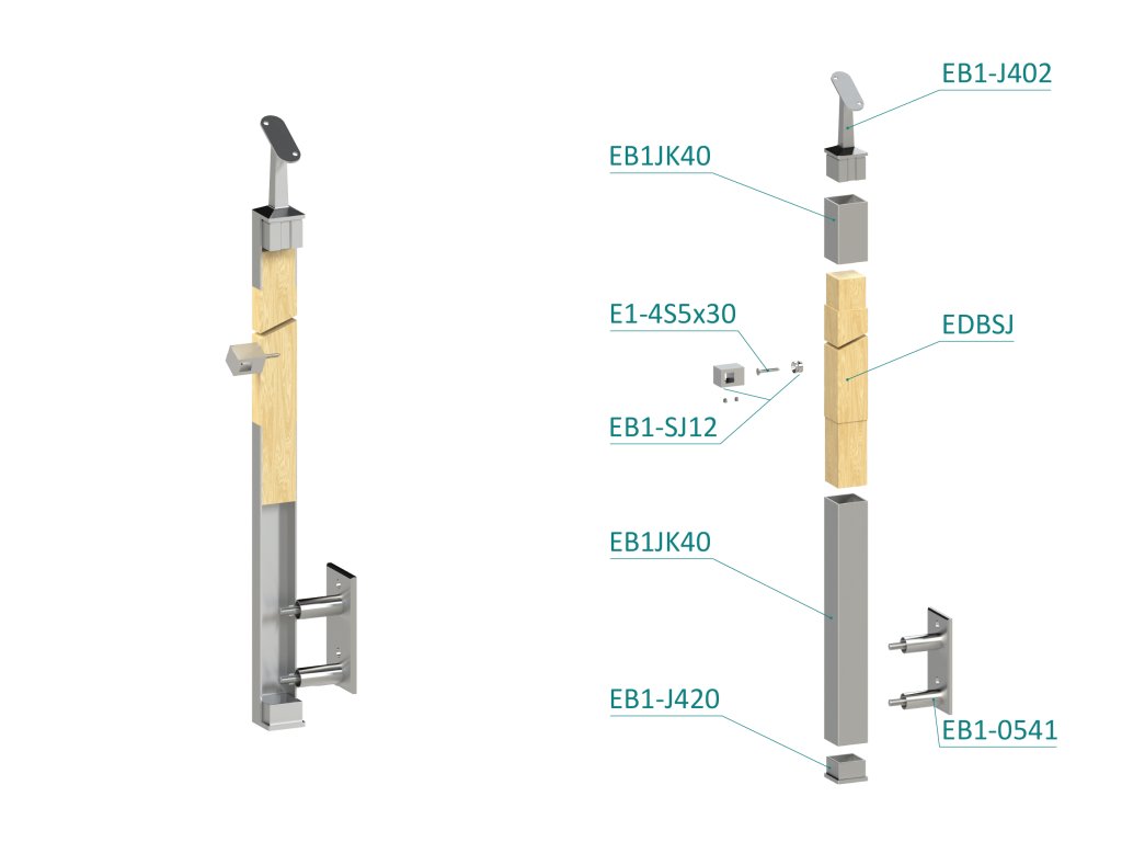 dřevěný sloup, boční kotvení, 4 řadový, průchozí, vnější, vrch nastavitelný (40x40mm), materiál: buk, broušený povrch bez nátěru