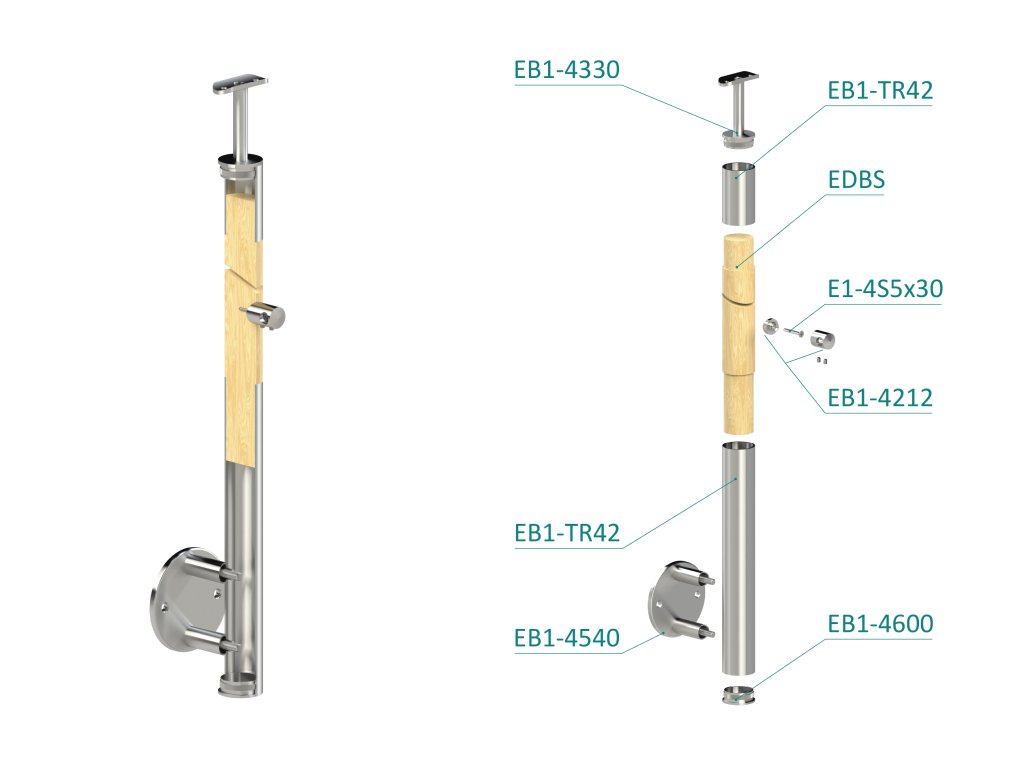 dřevěný sloup, boční kotvení, 4 řadový, průchozí, vnější, vrch pevný (ø 42mm), materiál: buk, broušený povrch s nátěrem BORI (bezbarvý)