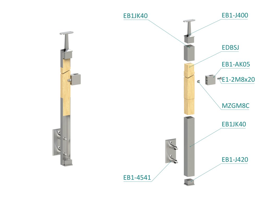dřevěný sloup, boční kotvení, výplň: sklo, levý, vrch pevný (40x40mm), materiál: buk, broušený povrch s nátěrem BORI (bezbarvý)