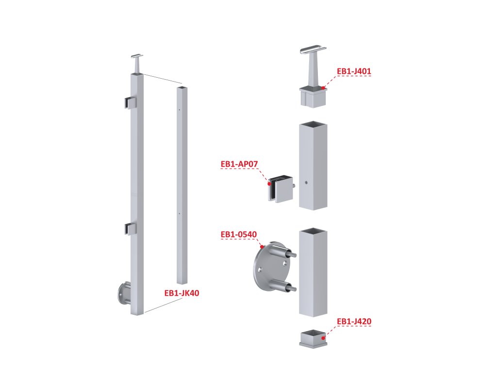 Nerezový sloup, boční kotvení, výplň: sklo, levý, vrch pevný (40x40 mm), broušená nerez K320 / AISI304Doplňkové parametry