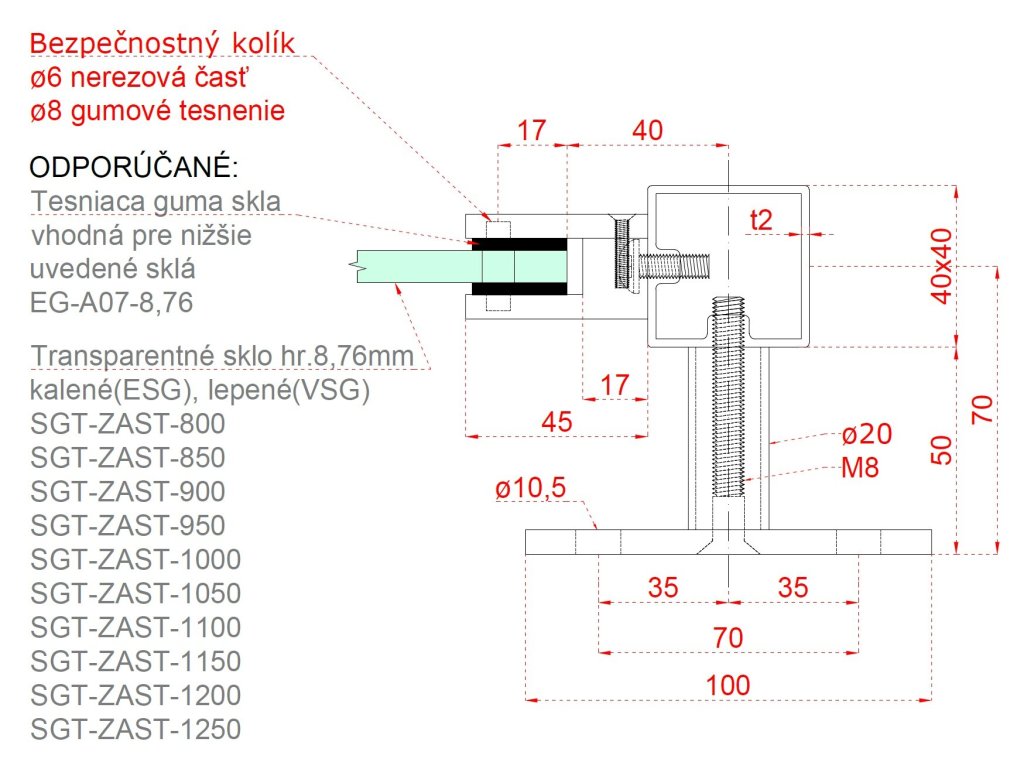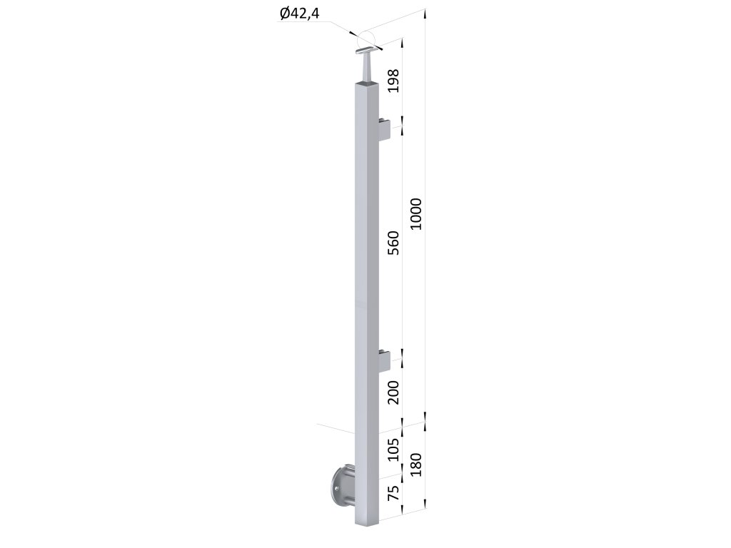 Nerezový sloup, boční kotvení, výplň: sklo, pravý, vrch pevný, (40x40 mm), broušená nerez K320 / AISI304Doplňkové parametry