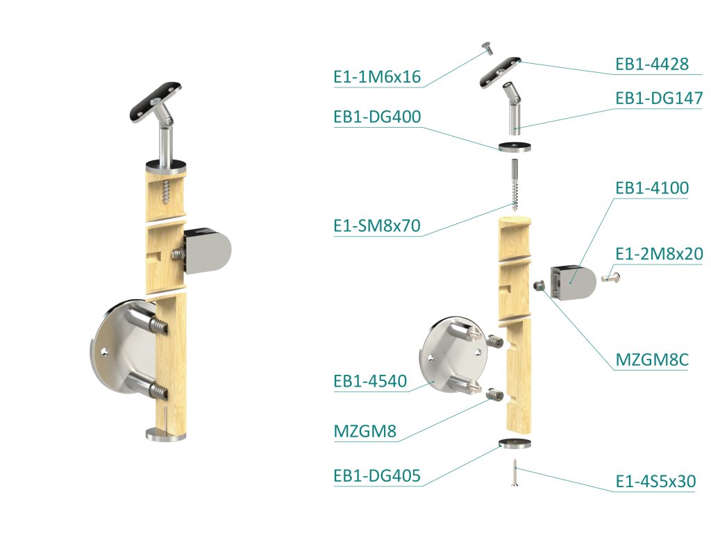 dřevěný sloup, boční kotvení, výplň: sklo, pravý, vrch nastavitelný (