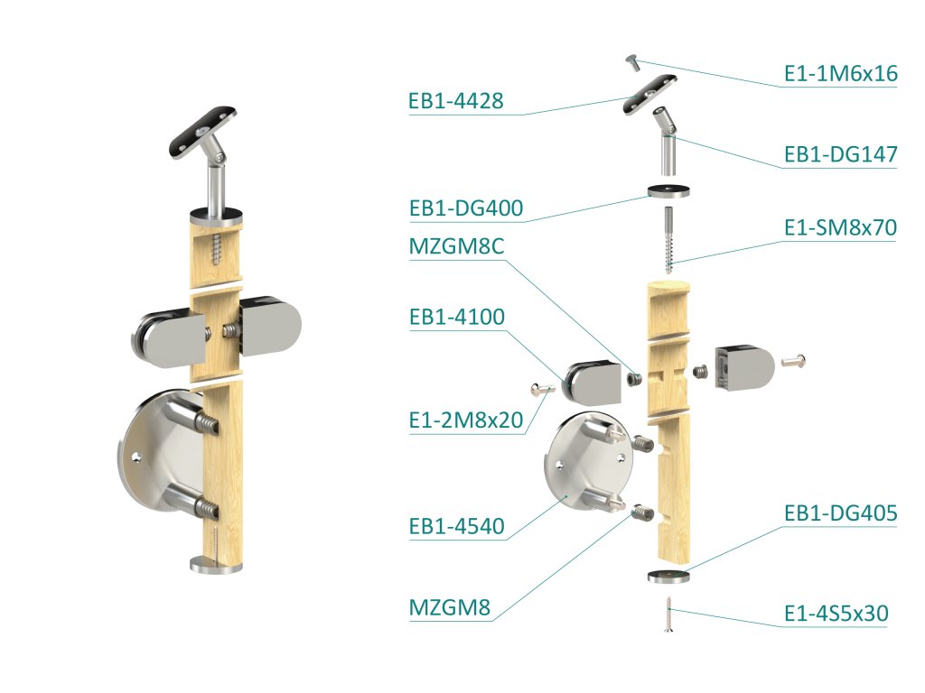 Dřevěný sloup, boční kotvení, výplň: sklo, průchozí, vrch nastavit. (Ø 42mm), materiál: buk, broušený povrch s nátěrem BORI (bezbarvý)Doplňkové parametry