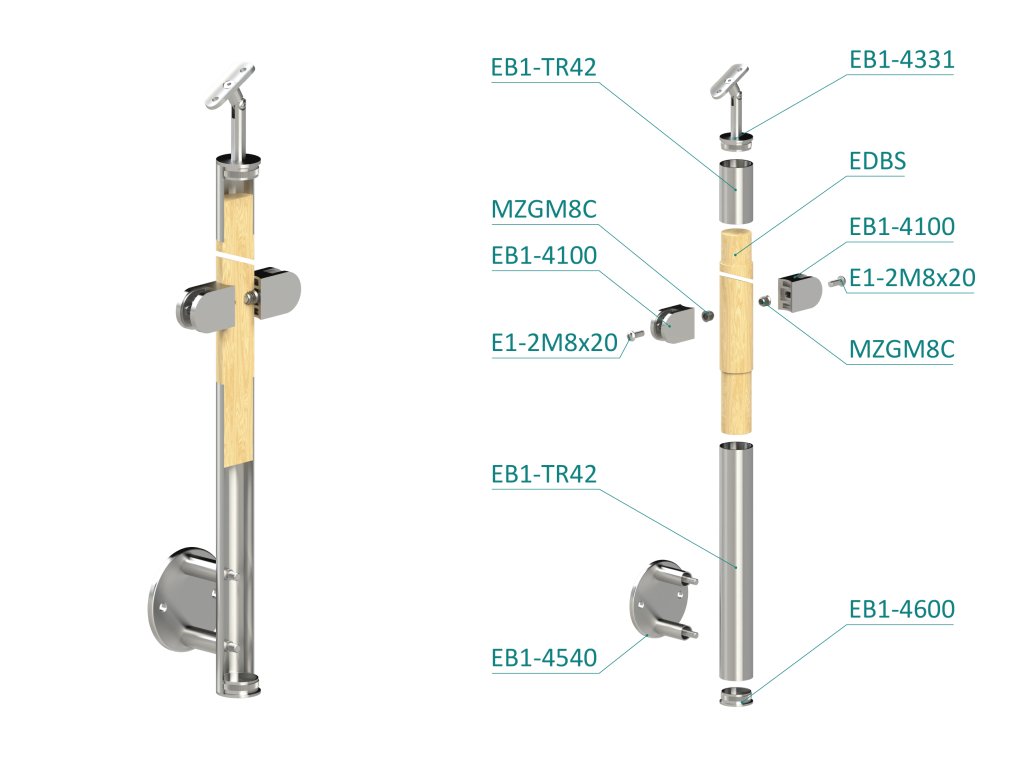 dřevěný sloup, boční kotvení, výplň: sklo, průchozí, vrch nastavitelný (ø 42mm), materiál: buk, broušený povrch s nátěrem BORI (bezbarvý)
