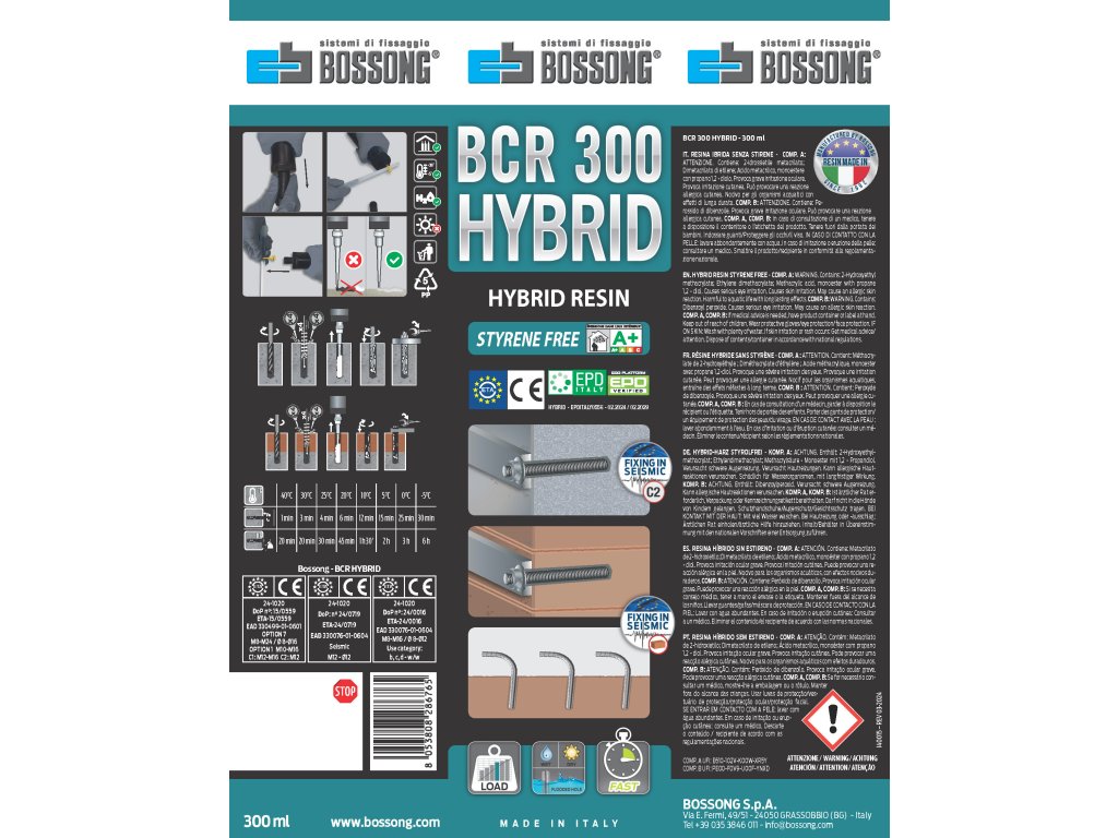 Bossong BCR300 HYBRID obsahuje inovativní dvousložkovou chemickou kotvu na bázi hybridní technologie (vinylester + cement), která je navržena pro vysoce výkonné a spolehlivé kotvení v široké škále stavebních materiálů. Toto 300ml balení je ideální pro profesionály vyžadující maximální flexibilitu a certifikovaný výkon.Klíčové vlastnosti a výhody BCR300 HYBRID: