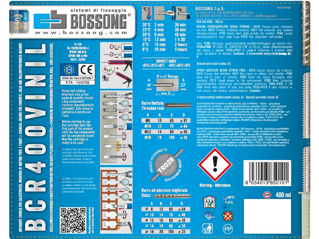 Bossong BCR400 HYBRID obsahuje stejnou inovativní dvousložkovou chemickou kotvu na bázi hybridní technologie (vinylester + cement) jako menší balení. Toto balení o objemu přibližně 400ml je určeno pro rozsáhlejší aplikace a profesionály, kteří potřebují větší objem kotevní hmoty při zachování špičkového výkonu.Klíčové vlastnosti a výhody BCR HYBRID (platné pro celou řadu):