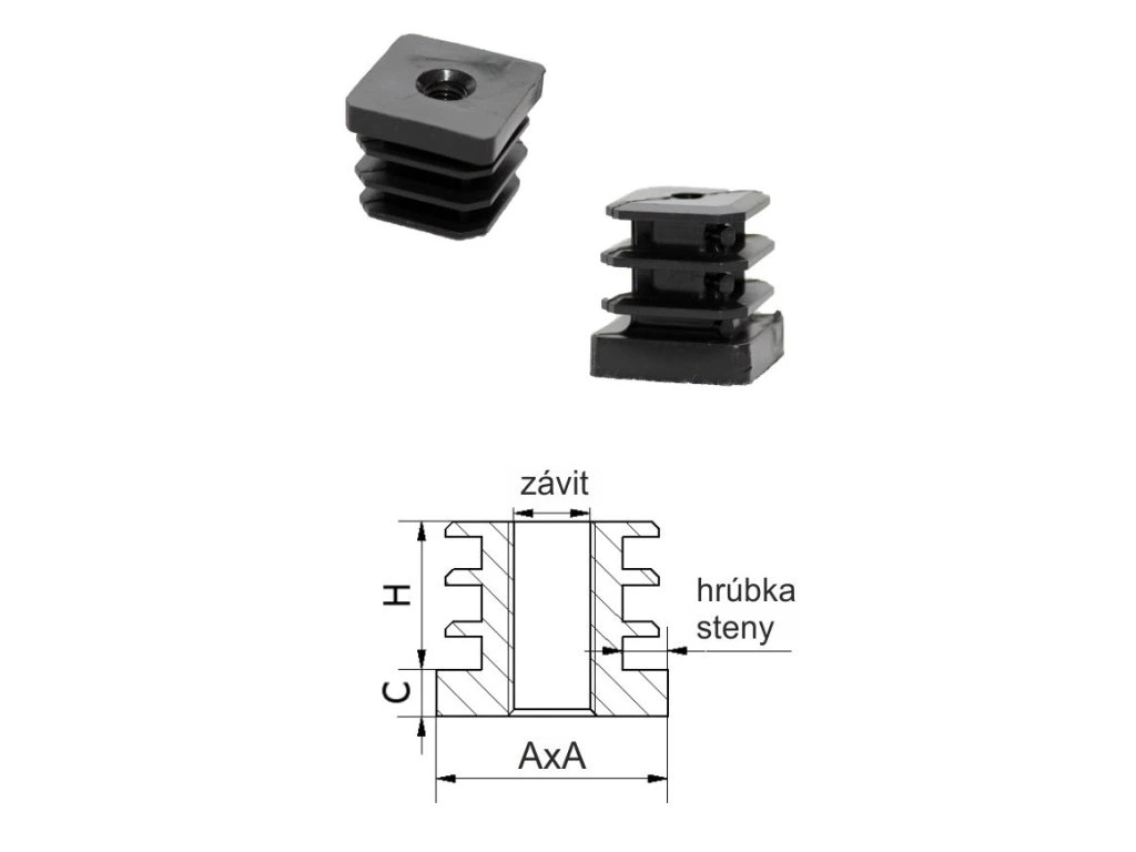 M8,A-30mm,H-20mm,C-6.2mm, černá, tloušťka stěny 2,0 mm,Plastová štvorcovo-rúrková zátka zo závitom PE
