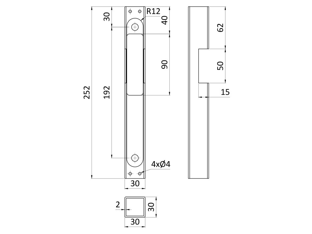 Dorazová kazeta pravá / levá pro elektrický zámek EZ332 (260x30x30 mm), nezinkovaná, vhodná k přivaření