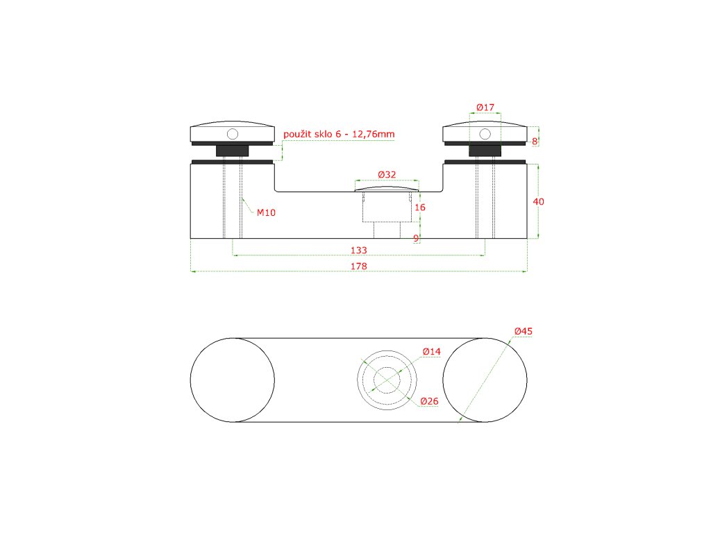 Bodové kotvení skla 6-12,76mm (ploché), dvě bodové svorky skla ø 45mm, broušená nerez K320 /AISI304/, balení obsahuje gumičky na skloDoplňkové parametry