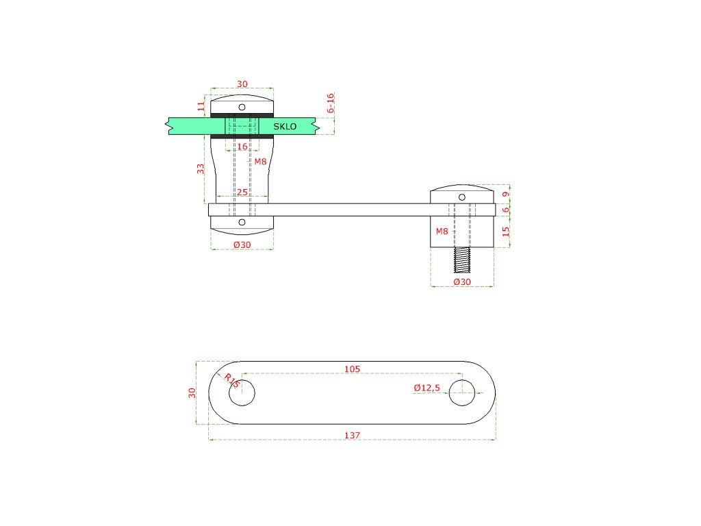 Boční kotvení na sklo 6-16 mm (ploché), jedna bodová svorka skla ø30 mm, broušená nerez K320 / AISI304, balení obsahuje gumičky na skloDoplňkové parametry