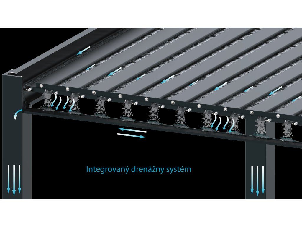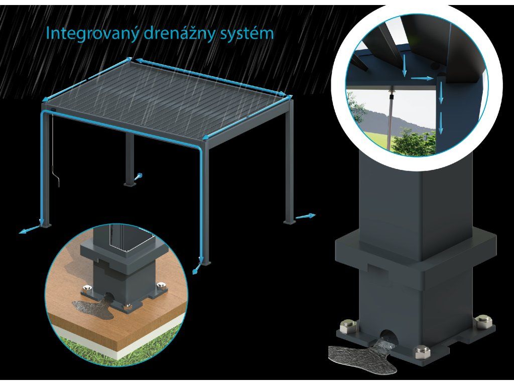 Voda je odváděna integrovaným drenážním systémem uvnitř konstrukce, takže si pergola poradí i se silnějším deštěm. Lamely dokážou odvést přibližně 17 l/m² za hodinu.