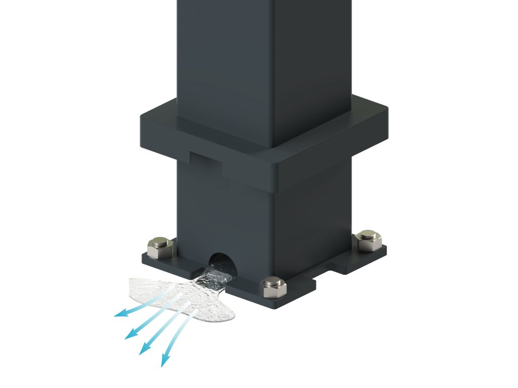 Nosné sloupy mají rozměr 116 × 116 mm. Při instalaci je třeba počítat s ocelovou patkou 160 × 160 mm (tloušťka 8 mm), zakrytou hliníkovým krytem 165 × 165 mm s integrovaným odvodněním.