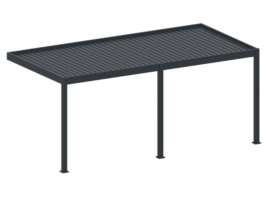 Pergola je vyrobena z kvalitního hliníku s práškovým lakem v matné antracitové barvě RAL 7016. Konstrukce je pevná, odolná vůči povětrnostním vlivům a díky čistému designu zapadne do jakéhokoli prostředí.