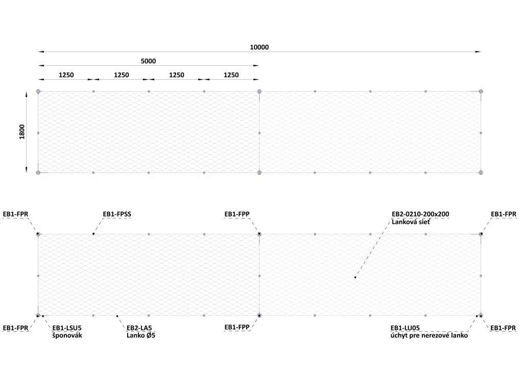 Set pro fasádní lankovou stěnu, rozměr: 1.8×10 m, odsazení od stěny: 200 mm, nerez – kombinace AISI 304 a 316. Obsahuje potřebné množství komponentů