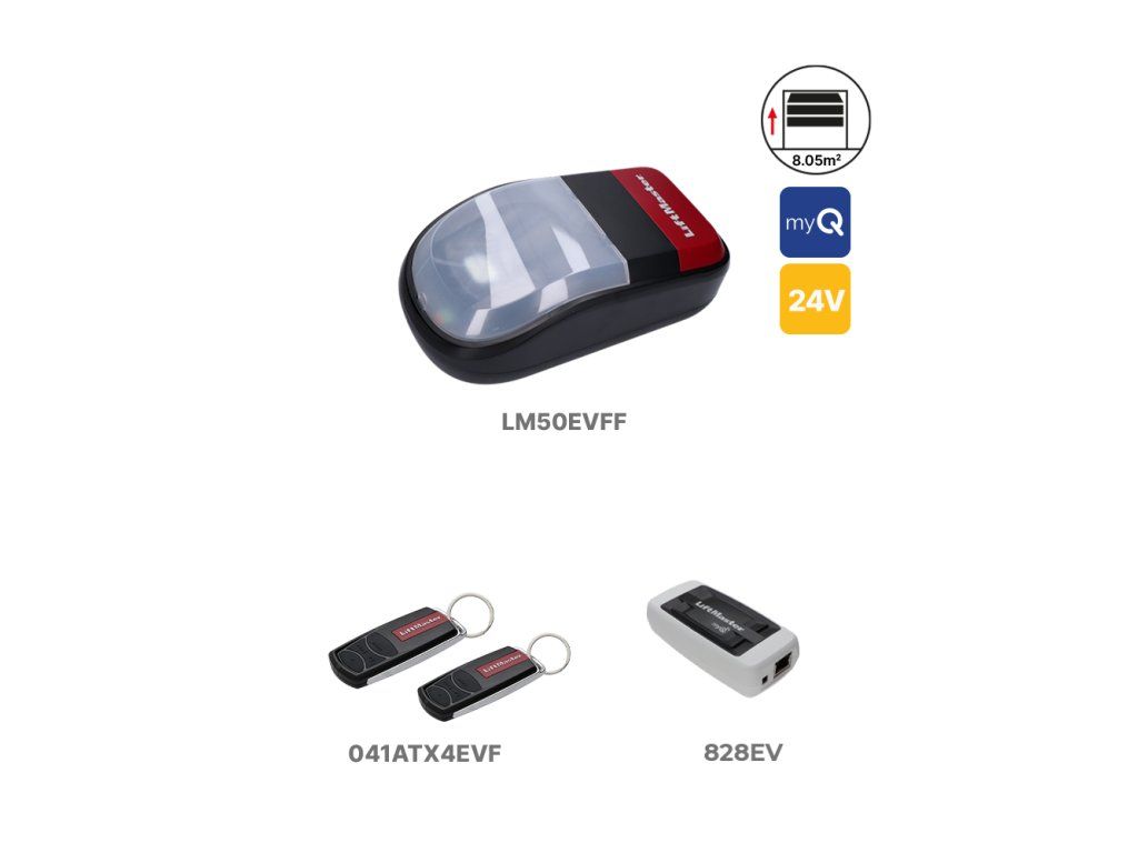 LiftMaster LM50EVFF1 je kompaktní a spolehlivý 24V pohon pro sekční garážová vrata o hmotnosti do 80 kg, šířce do 3,5 metru a výšce 2,3 metru. Pohon má integrované LED osvětlení a moderní, kompaktní design. Podporuje technologii myQ, která umožňuje ovládání vrat odkudkoli prostřednictvím chytrého telefonu, tabletu nebo počítače.