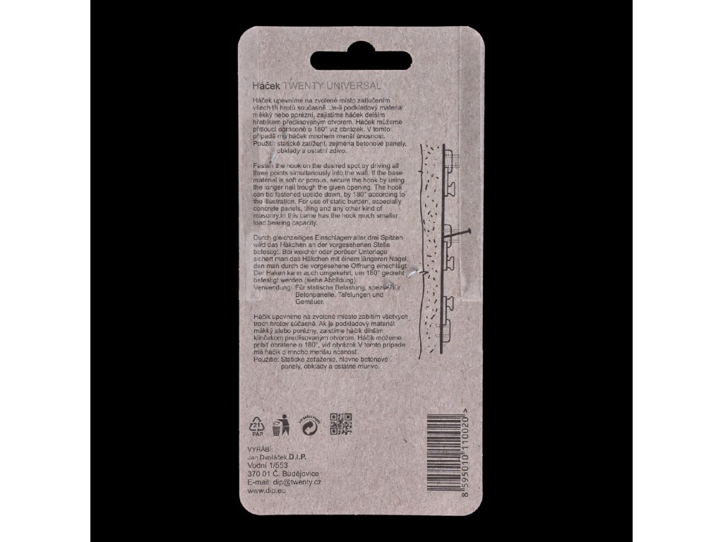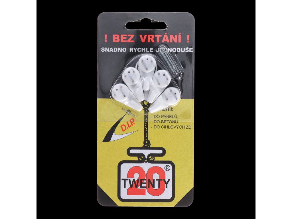 Háček Twenty UNIVERSALHáčky TWENTY UNIVERSAL jsou vyrobeny z vysoce kvalitní plastické hmoty Polyamid (Nylon), která vyniká maximální pevností a odolností. Rovněž použité hroty ze speciální kalené oceli jsou povrchově antikorozně upraveny a umožňují aplikaci háčku i v krajně nepříznivých podmínkách.