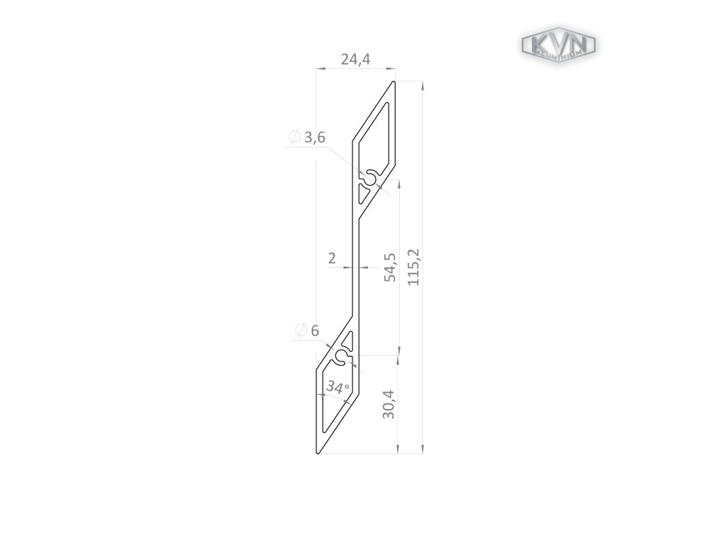 2 mm tlustý profil na výplň 115,2x24,4x6000 mm, materiál EN AW-6060 T66, přírodní hliník bez povrchové úpravy, cena za KUS