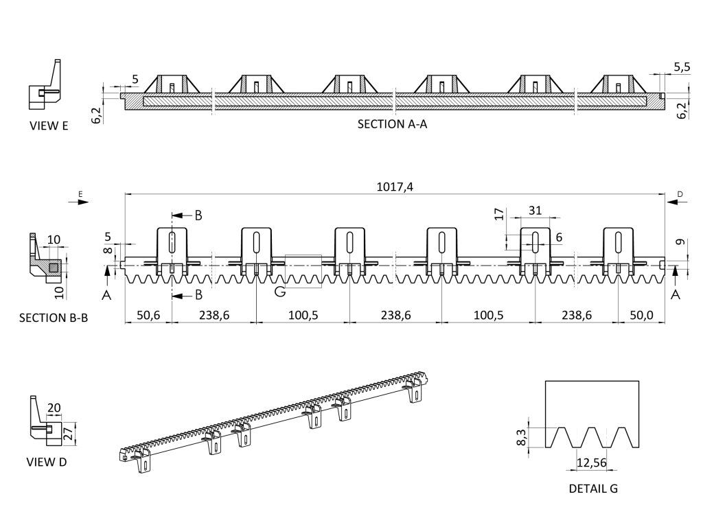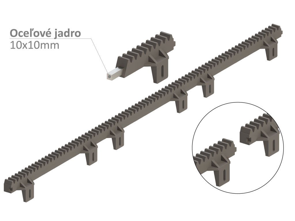 Nylonový hřeben CREM‑PH s ocelovým jádrem a horním uchycením je určený pro pohony posuvných bran s hmotností do 600 kg. Spojení pevné kovové výztuhy a odolného nylonového povrchu zajišťuje tichý a bezproblémový provoz.