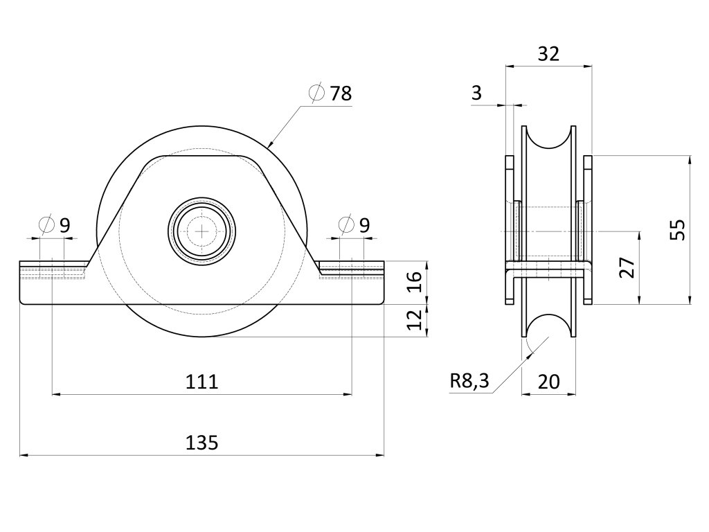 Kladka ø 78 mm s nylonovým kolečkem pro zapuštění do jeklu, pro profil C902IX16, nosnost 200 kg, nerez / AISI304