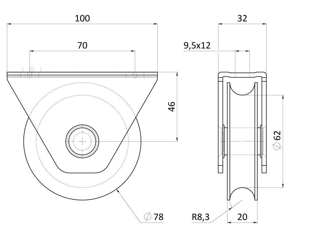Vodící kladka ø 78 mm s nylonovým kolečkem pro montáž pod rám, pro profil C902IX16, nosnost 200 kg, nerez / AISI304
