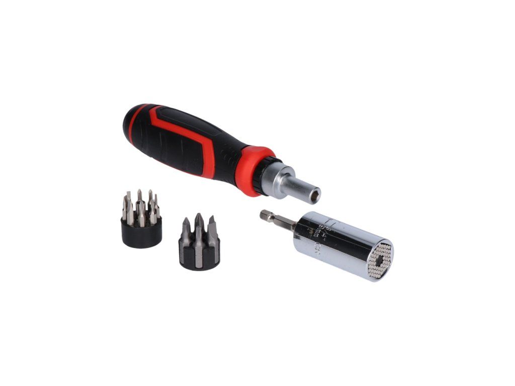 Multifunkční šroubovák s ráčnou je praktický nástroj, který vám usnadní práci s různými typy šroubů a matic. Díky univerzální ráčně a sadě nástavců jej můžete používat pro širokou škálu úloh, od montáže nábytku až po opravy automobilů.Vlastnosti: