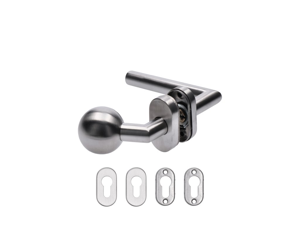 Klika (pravá) + koule (otočná), vyhnutá včetně spodní rozety, balení: 1ks klika (pravá), 1ks koule, 2ks spodní oválná rozeta, broušená nerez AISI304Doplňkové parametry