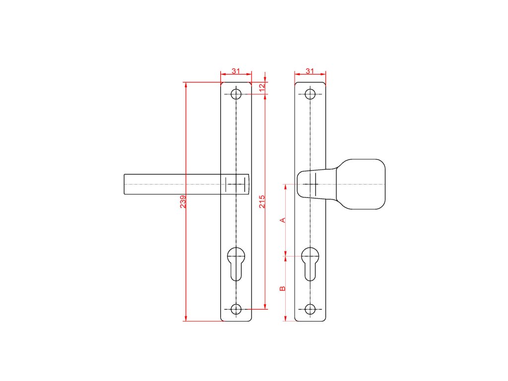 Klika AL, rozměr štítku 239 x 32 mm, rozteč 72 mm, černá prášková barva vypalovaná, s otvorem pro stavební vložku, pár