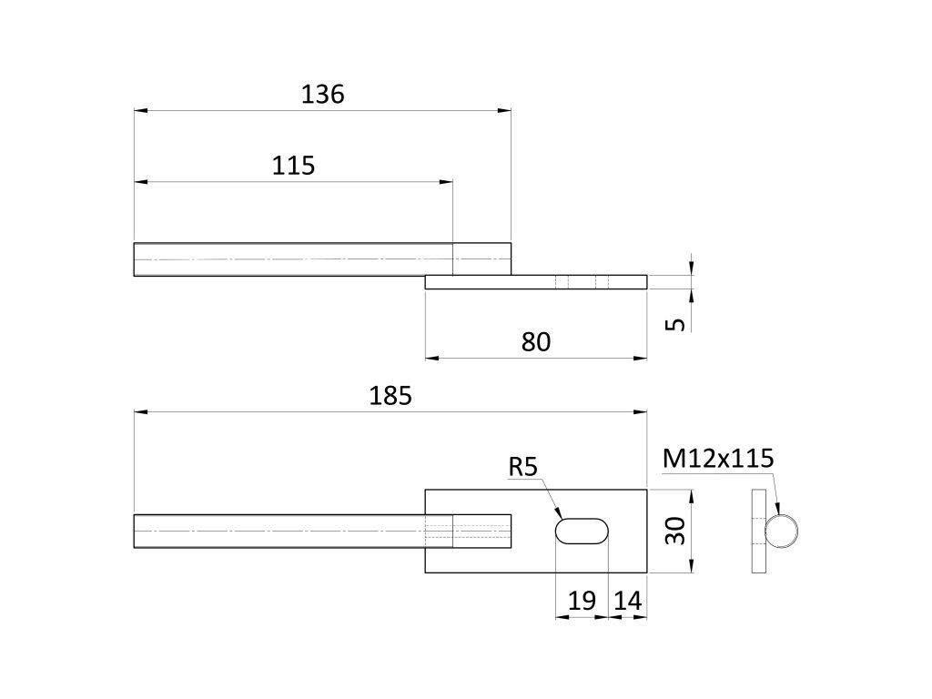 Toto kotvení má rozměry M12 o délce 185 mm a šířce 30 mm, o tloušťce 5 mm.