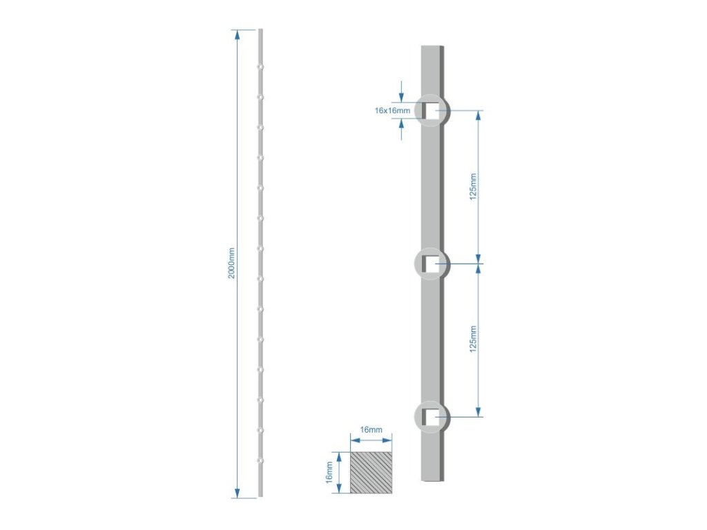 Probíjená tyč 16 x 16 mm, rozteč děr 125 mm, délka 2000 mm, oko 16 x 16 mm, na tyči je 14 děrDoplňkové parametry