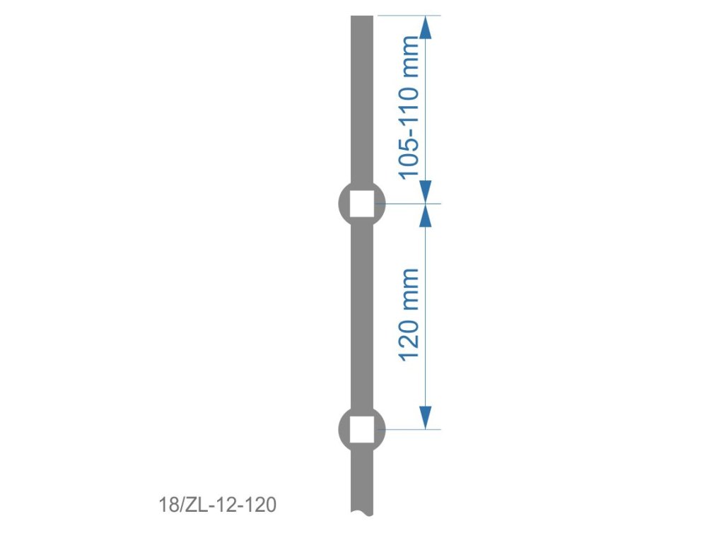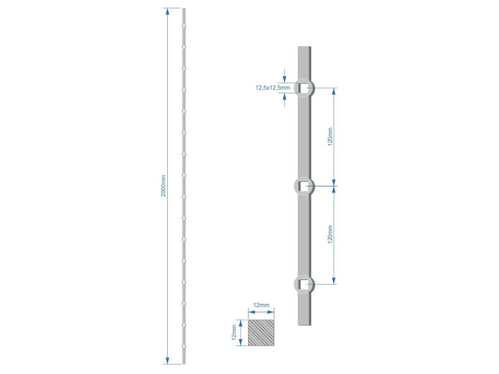 Probíjená tyč dělky 2000 mm, opískovaná, profil 12 x 12 mm, rozteč děr 120 mm, oko 12,5 x 12,5 mm, na tyči je 16 děrDoplňkové parametry