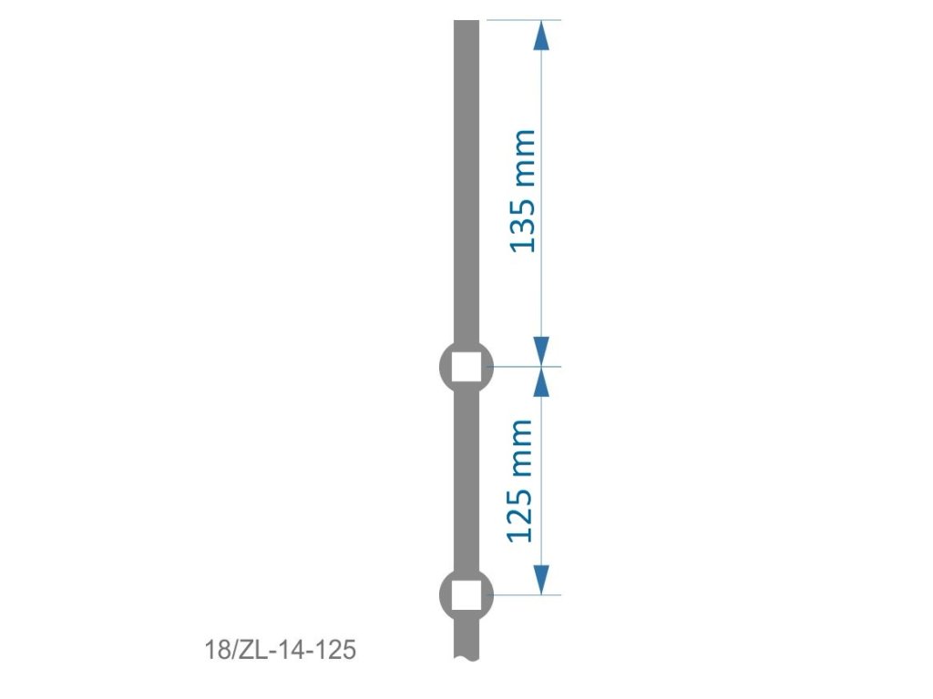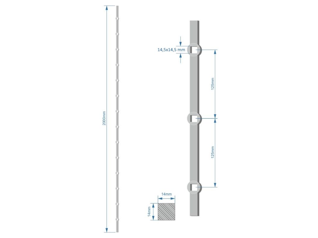 Probíjená tyč délky 2000 mm, opískovaná, profil 14 x 14 mm, rozteč děr 125 mm, oko 14,5 x 14,5 mm, na tyči je 14 děrDoplňkové parametry