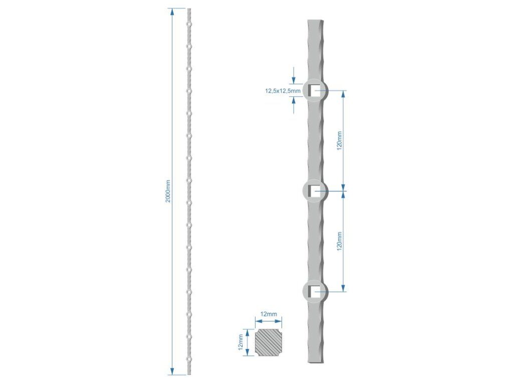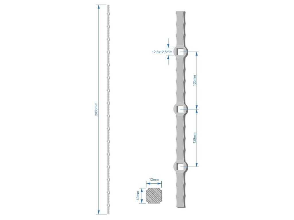 Probíjená tyč H 2000 mm opískovaná, zdobený profil 12x12 mm, rozteč děr 120 mm, na jedné tyči je 16x oko 12,5x12,5 mmDoplňkové parametry