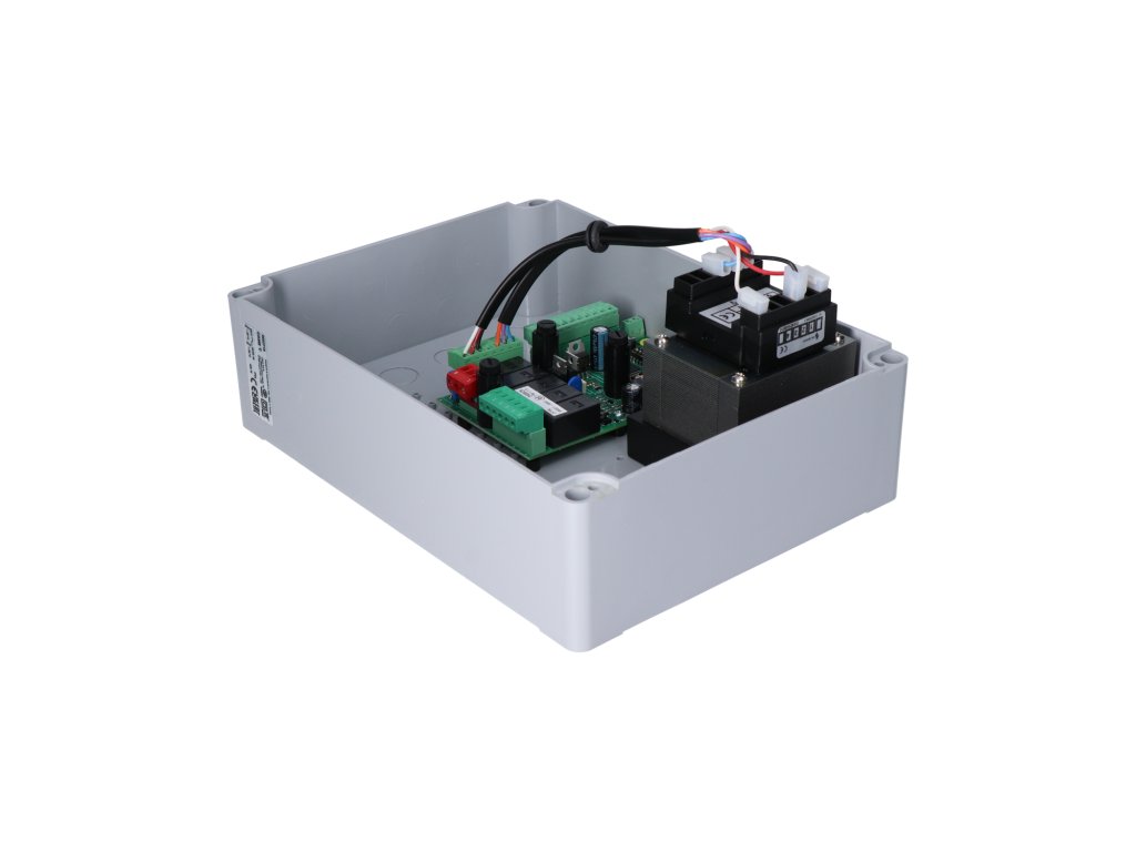 Elektronika je dodávána s transformátorem a je umístěna v robustním plastovém boxu, což zajišťuje ochranu komponentů a jednoduchou instalaci