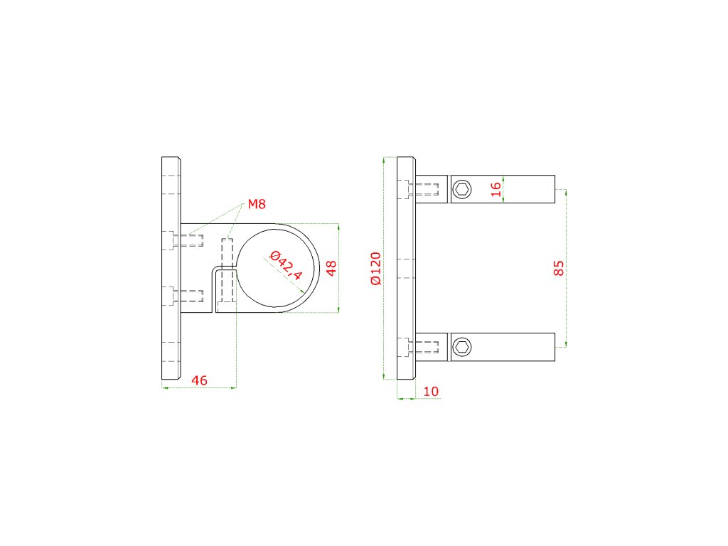 Úchyt na boční kotvení sloupu ø 42,4 mm, (kotevní deska ø 120 /10,0 mm), broušená nerez K320 / AISI304