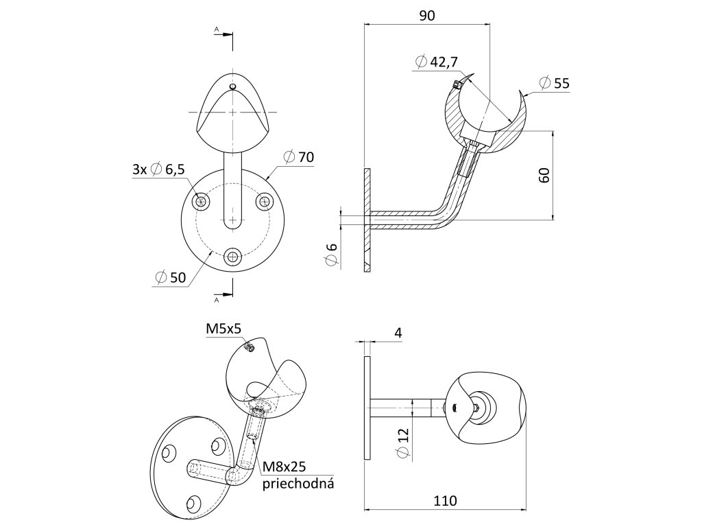 Držák LED madla na stěnu, na madlo EB1-HM42, EB1-JHM40, EB1-JHM60x40, broušená nerez K320 / AISI304Doplňkové parametry