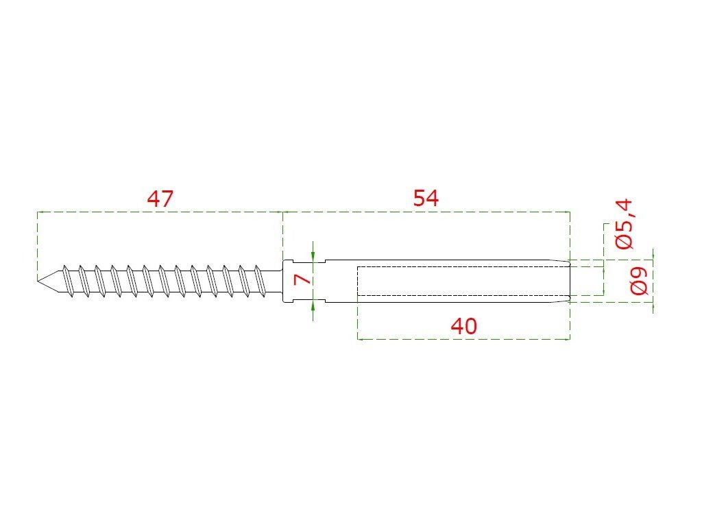 úchyt (lepící) pro nerezové lanko ø 5mm se závitem do dřeva, ( ø 8mm / L: 100mm), broušená nerez K320 /AISI316, použít lepidlo MD-GEL454/20