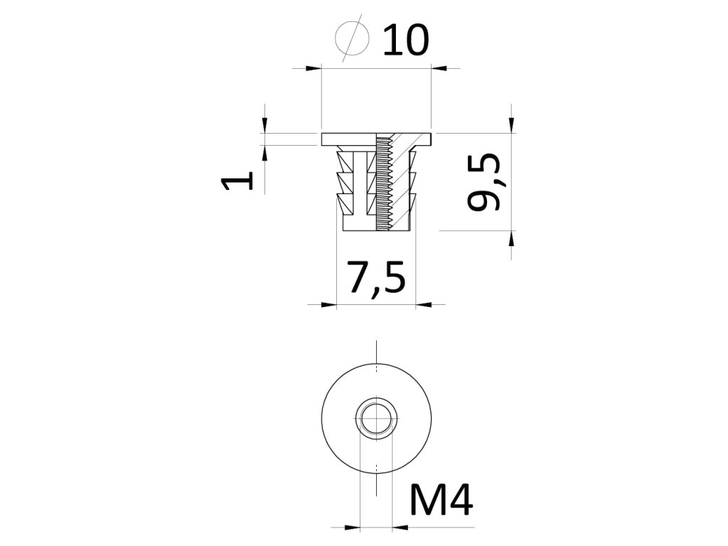Narážecí matice do dřeva M4x9.4 s vnitřním metrickým závitem, zinková slitina