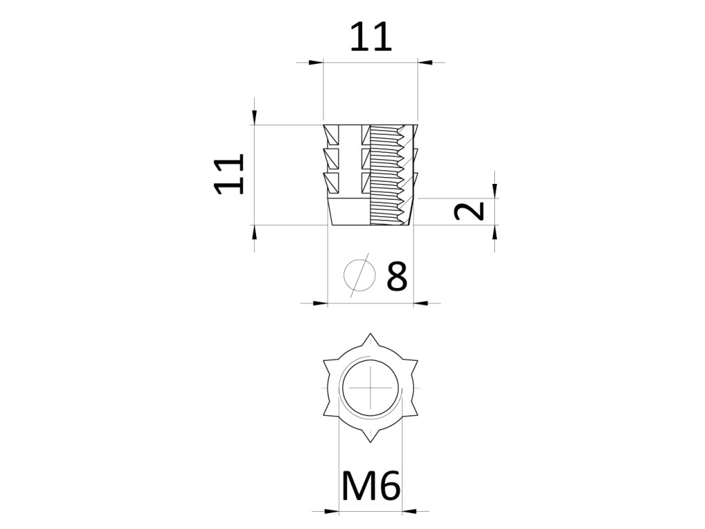 Narážecí matice do dřeva M6x11 s vnitřním metrickým závitem, zinková slitina