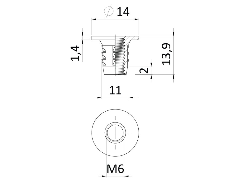 Narážecí matice do dřeva M6x13.9 s vnitřním metrickým závitem, zinková slitina