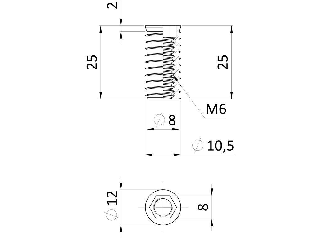 Závrtná matica M6x24 s vnútorným metrickým závitom a imbus šesťhranom, poniklované