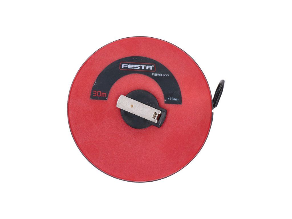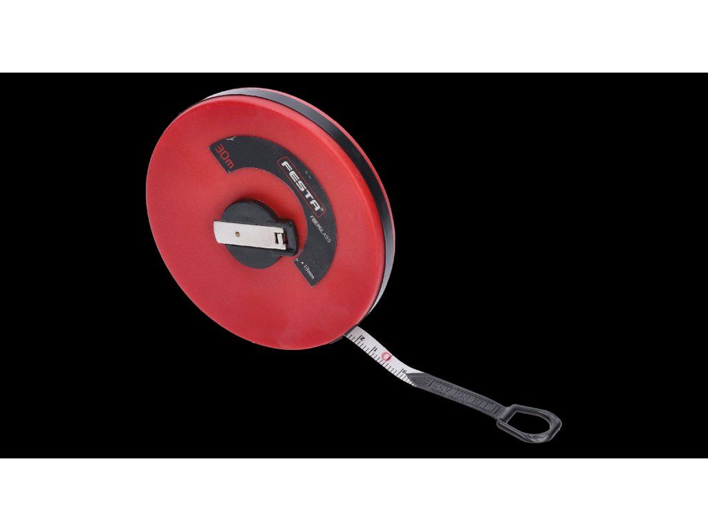 30m sklolaminátové meracie pásmo, páska zakončená očkom s gumovou ochranou, sklopná navíjacia rúčka, pútko