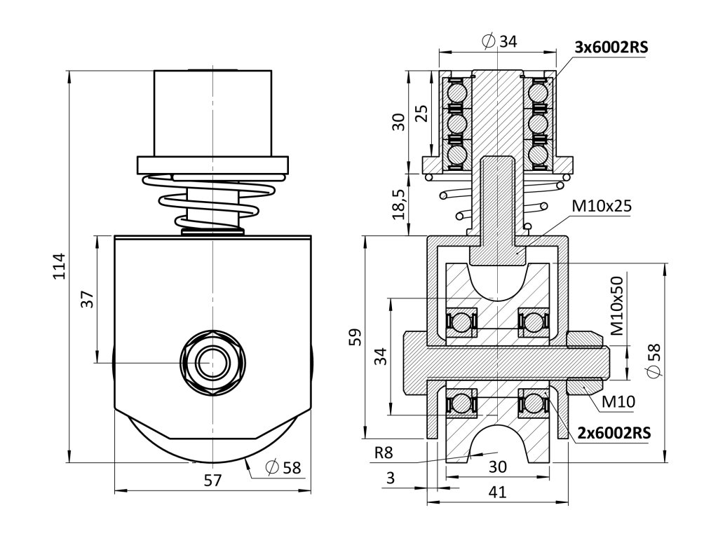 Otočné vodicí kolečko 58 mm, pro U profil ø16 mm