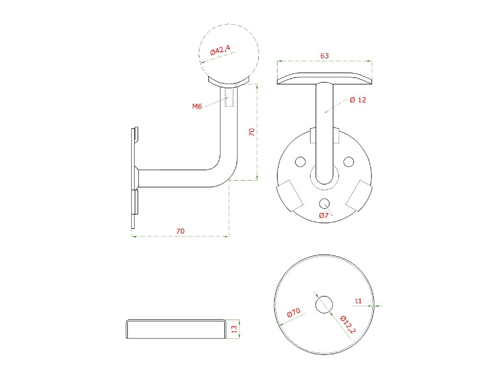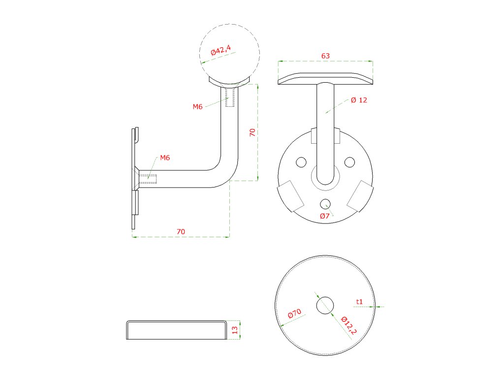 Držák madla na stěnu s krytkou kotvící desky, na trubku ø 42,4 mm, broušená nerez K320 / AISI304Doplňkové parametry