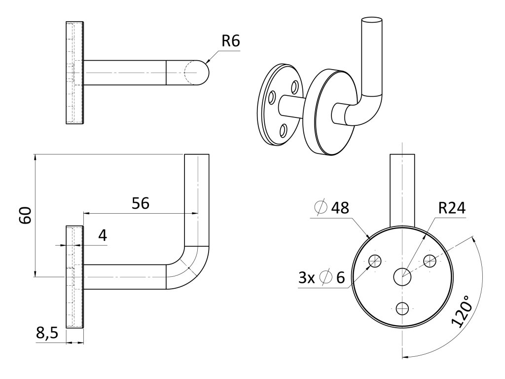 držák madla se zkrácenou vzdáleností od zdi - navařovací s krytkou, broušená nerez K320 /AISI304