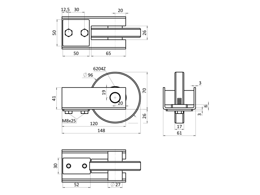 Náběhové kolečko samonosné brány pro profil 95x100mm