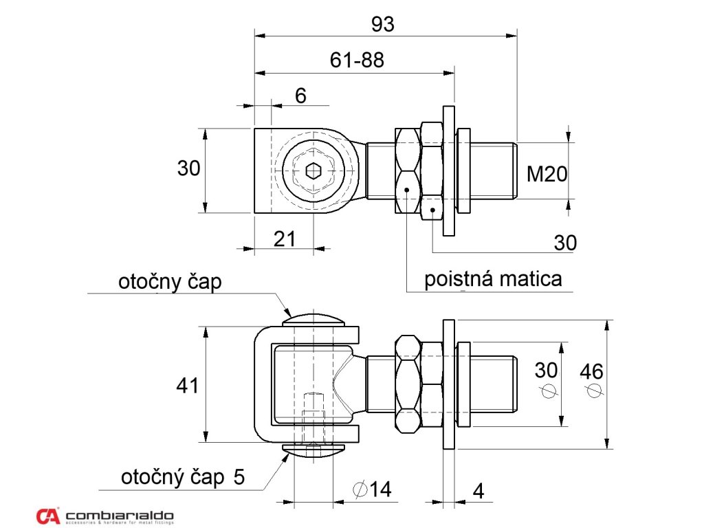 Regulovateľný, navárací záves-pant, závit M20 od popredného talianského výrobcu Combi Arialdo. Povrchová úprava- pozink, časť v tvare U /prizvára sa na krídlo brány/ - bez povrcovej úpravy. Použitie pre ľahké brány. Zaťaženosť krídla zvýši kombinácia so spodným závesom C348/20 a C349/20. Počet kusov v balení - 10.Pri montáži je možné krídlo brány nastaviť pomocou matice /30mm/ nalisovanej na podložke, ktorá je prizváraná o nosný stĺp. Následne sa zaistí kontramaticou /24mm/. Veľkou výhodou je montáž a demontáž krídla cez otočný čap zaistený zo spodu skrutkou /imbusový kľúč 4mm/.