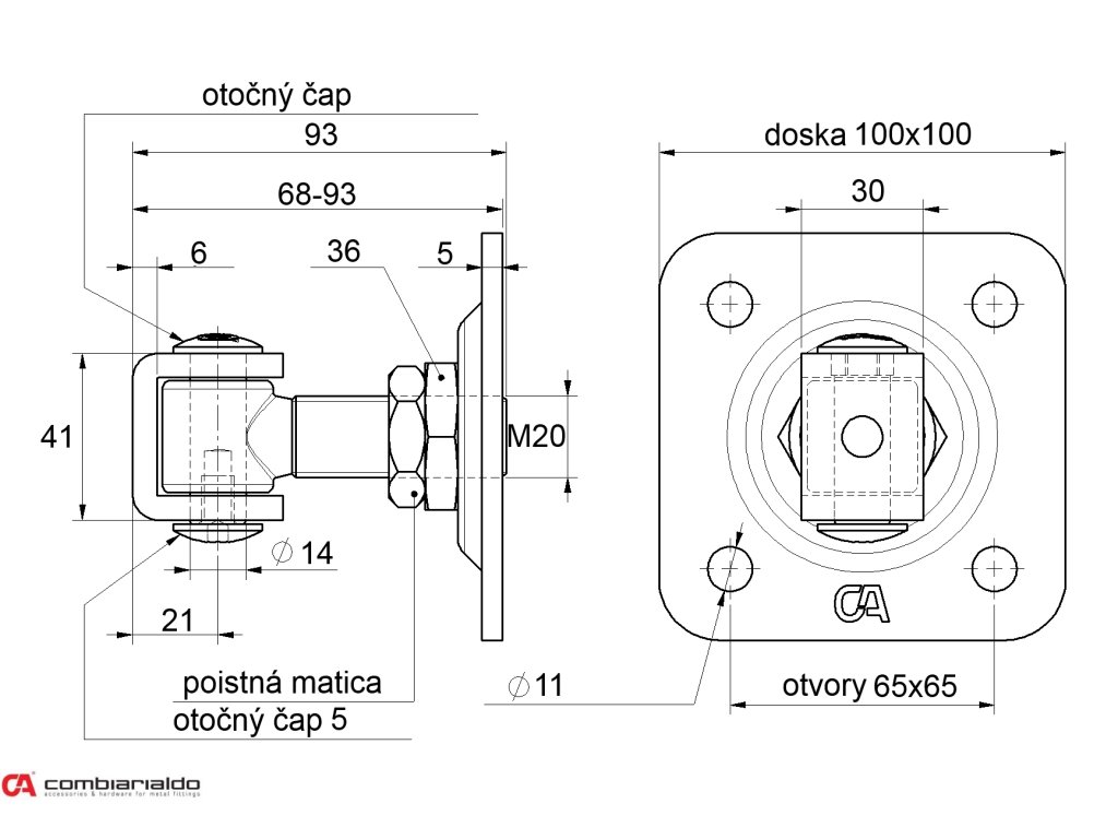 COMBI ARIALDO pant M20 s plotnou 100 x 100 mm, otevíratelný 90°, nastavitelný 1D, částečně pozinkovaný