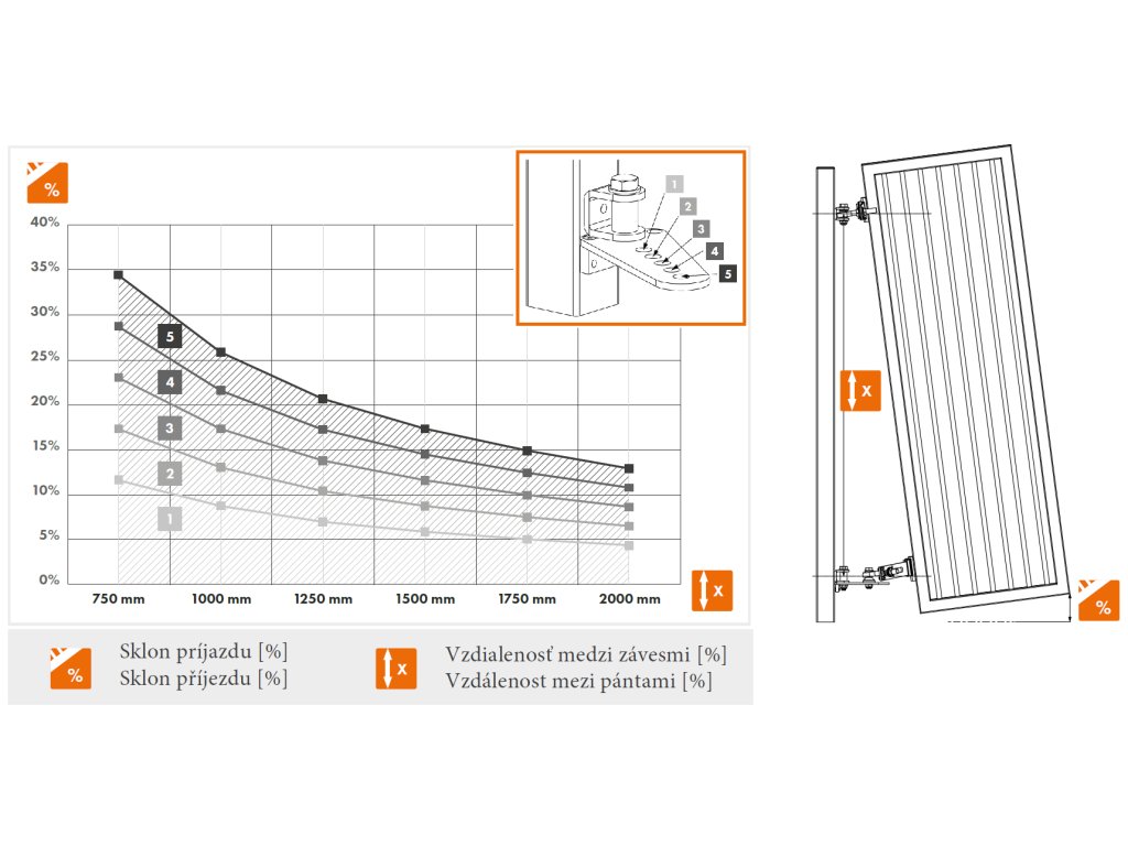 Nastavitelné pro sklon od 2 do 35 % (v závislosti na vzdálenosti mezi panty)