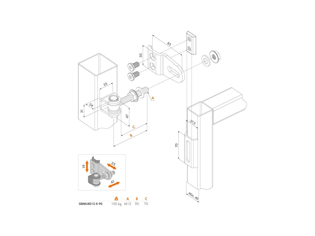 Navařovací pant, otevíratelný 180°. Po instalaci je nastavitelný ve třech-směrech. Nastavením pantů docílíte souběžnosti vyosených křídel (například vyosení sloupku vlivem mrazu). Závěs umožňuje regulaci 25 mm na šířku (X),.19 mm na výšku (Y) a 41 mm na hloubku (Z).Doporučené příslušenství: Bezpečnostní lanko LOCINOX® B-SAFE, LOCINOX® U-SAFE zabraňuje pádu vrat v případě selhání pantu (vyvinuté v souladu s předpisem EN 12604).